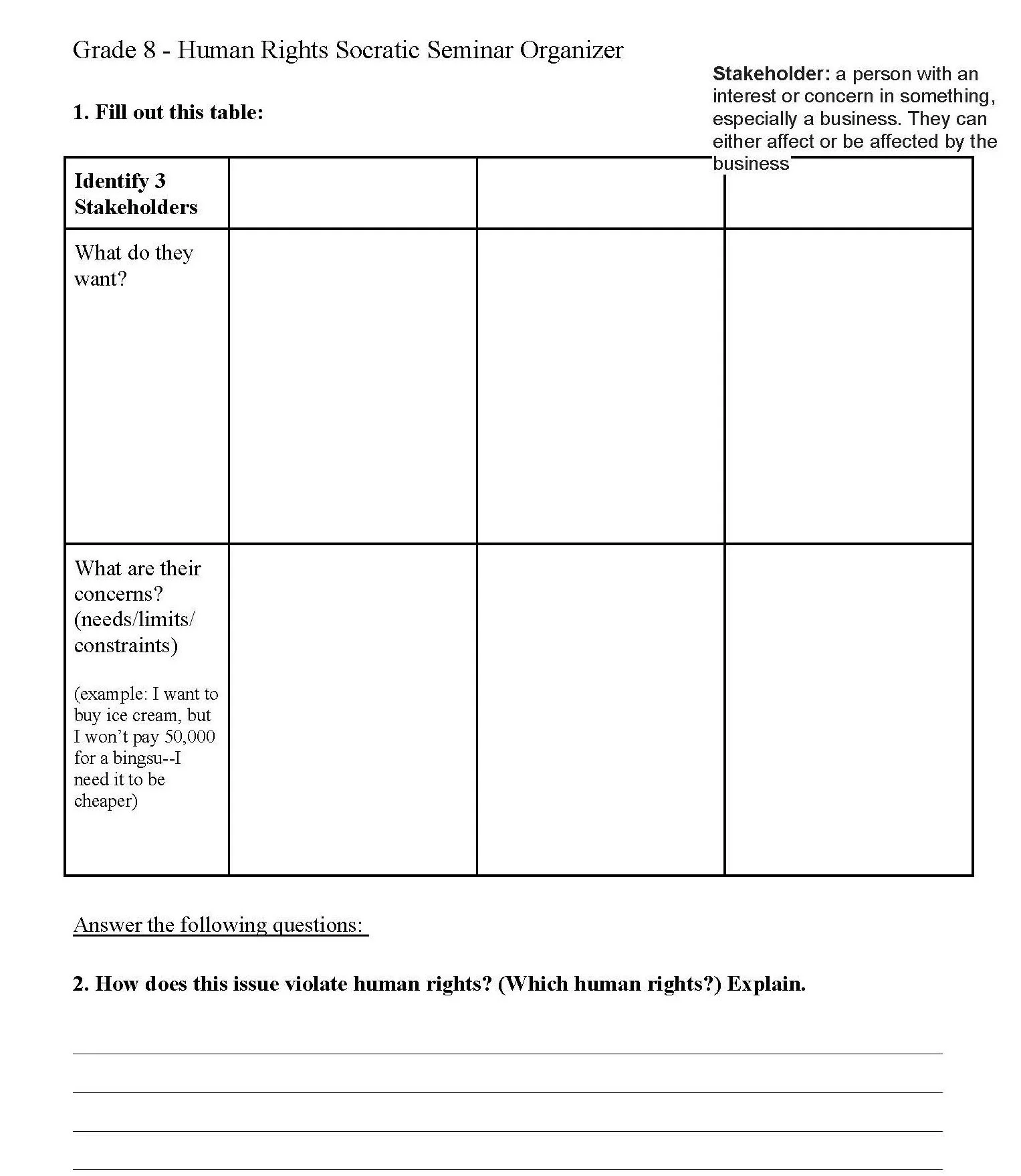 We divided the students into the three groups and they explored their topic in depth through the use of a guided worksheet. The activity culminated in a socratic seminar where they compared their case studies in order to determine what human rights were being violated and what factors were the leading cause to these violations. Was their issue an economic problem? A social problem? A political problem? Who are the main stakeholders and what would it take to convince one of them to change their behaviour?