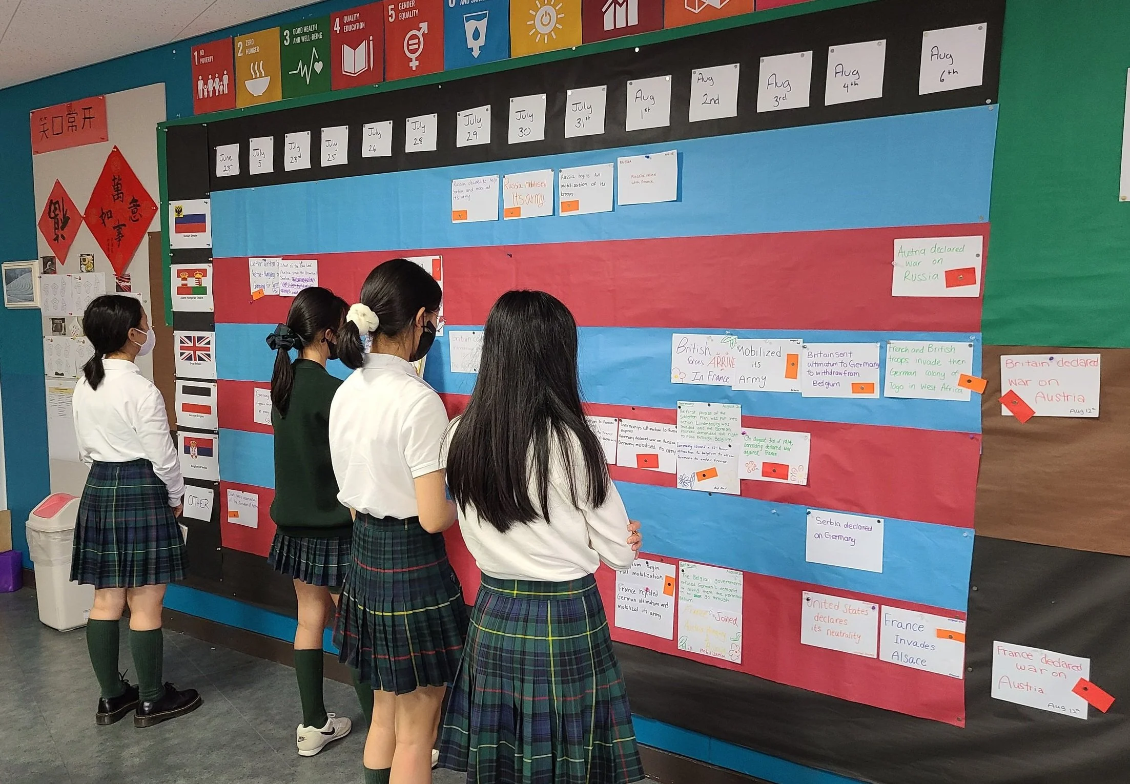 Once all of the actions that they identified were complete, we went through it as a class and used coloured strips of paper to label the actions. Orange meant a country was acting aggressively and red symbolized a declaration of war. We had a few disagreements but overall good discussion on what symbolized as “aggressive.” The end result looked like the image below: